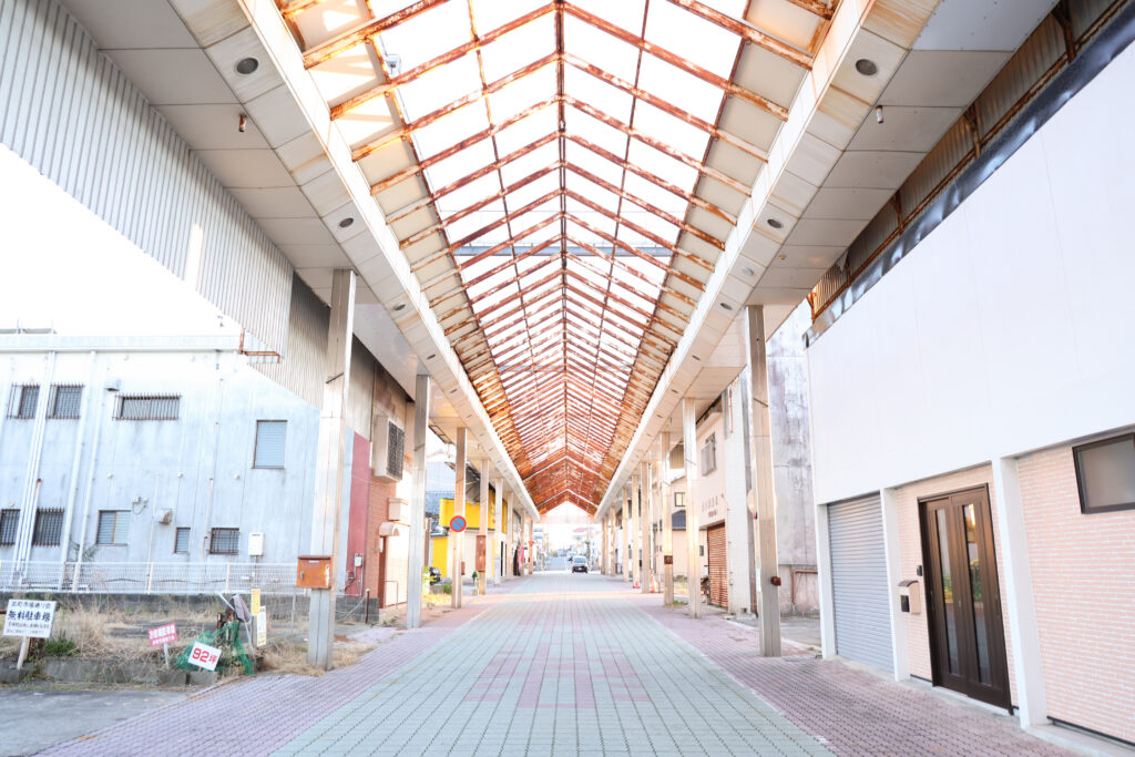 夕暮れが近づく商店街は、かつての賑わいを伝える建物や古い看板が残り、歴史の気配と静けさが同時に漂っていました。一方で、リノベーションされた店舗や、新しい挑戦を始めている姿も見え、地域に小さな変化が芽生えている場所があることも感じられました。